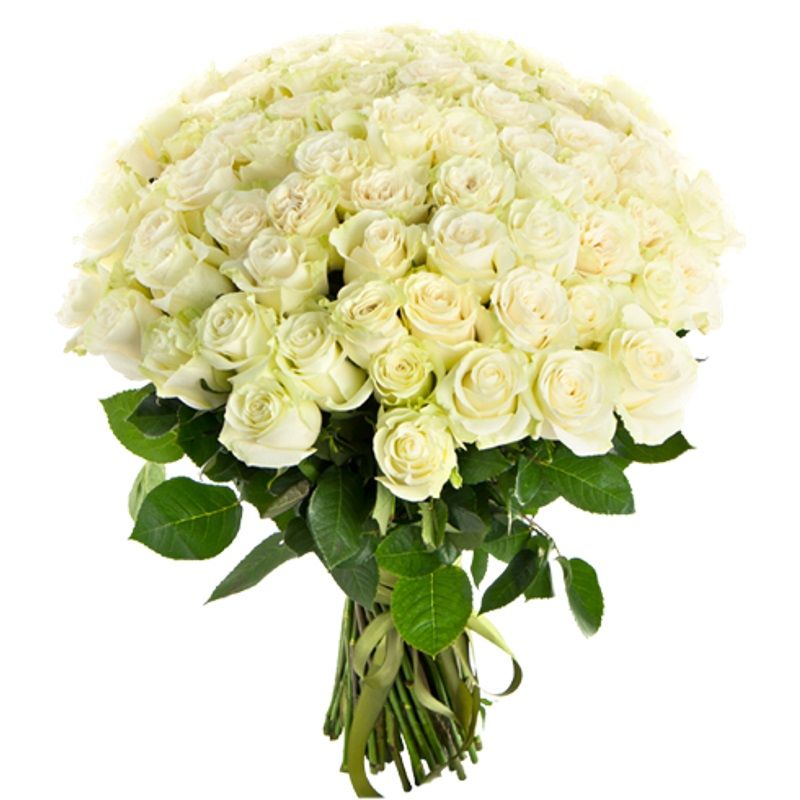 Букет состоит из 75 белых роз, прозрачная упаковка, белая лента.