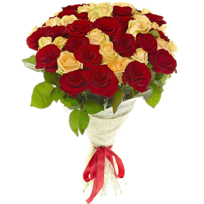 Букет состоит из 23 бордовые розы, 22 кремовые розы, красивая упаковка, атласная лента.