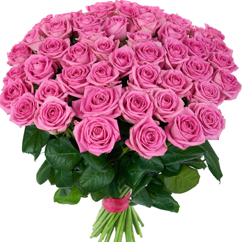 Букет состоит из 51 розовая роза, прозрачная упаковка, атласная лента.