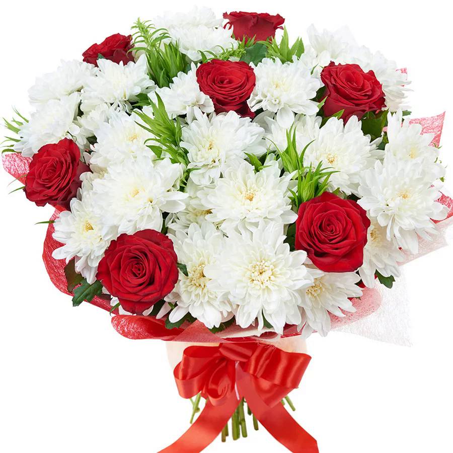 Букет состоит из 7 красных роз, 6 веток белой хризантемы, красивая упаковка.