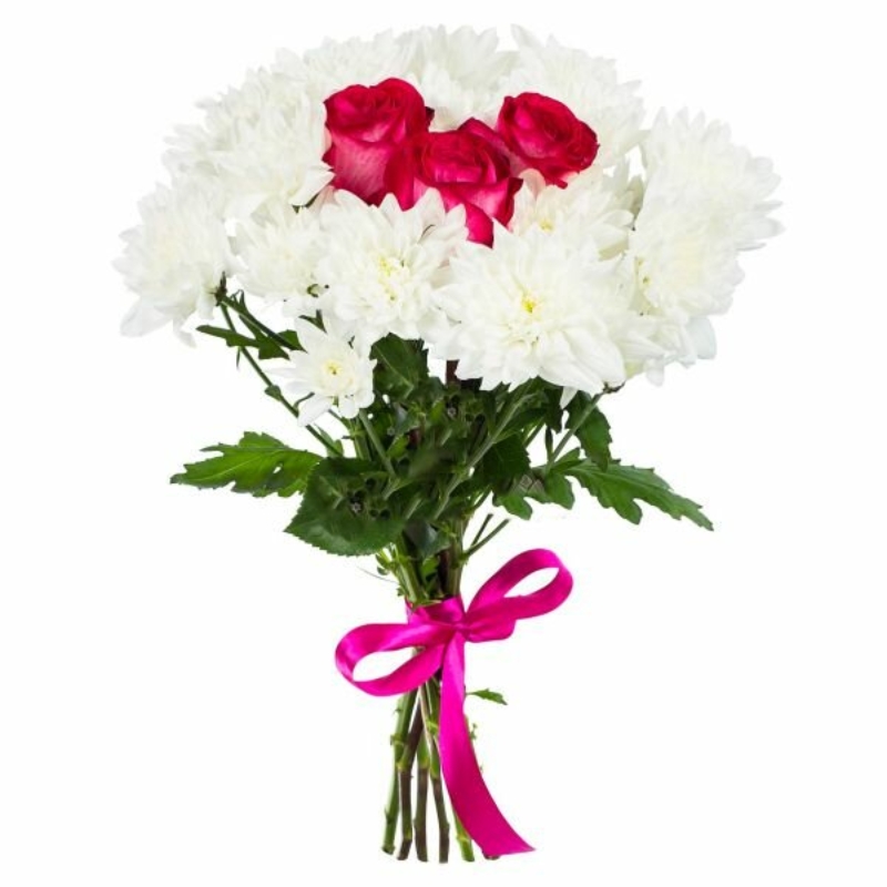 Букет состоит из 3 красные розы, 4 ветки белой хризантемы, прозрачная упаковка, атласная лента.