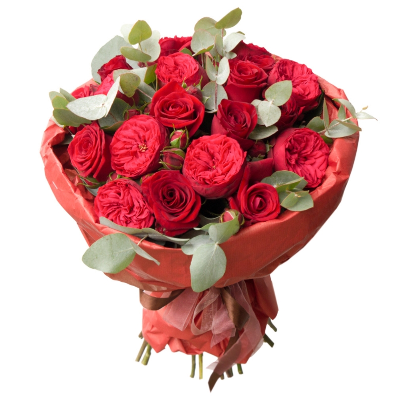 Букет состоит из 15 красных роз, 5 веток кустовых роз Red Piano, эвкалипт, крафт, атласная лента.