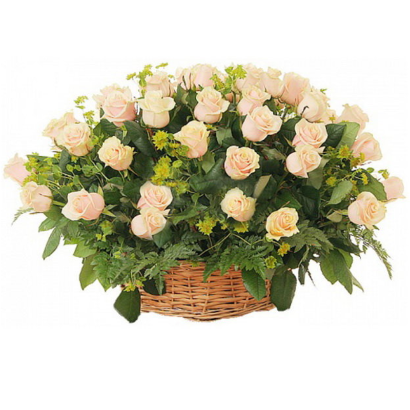 Корзина из 51 кремовой розы с зеленью