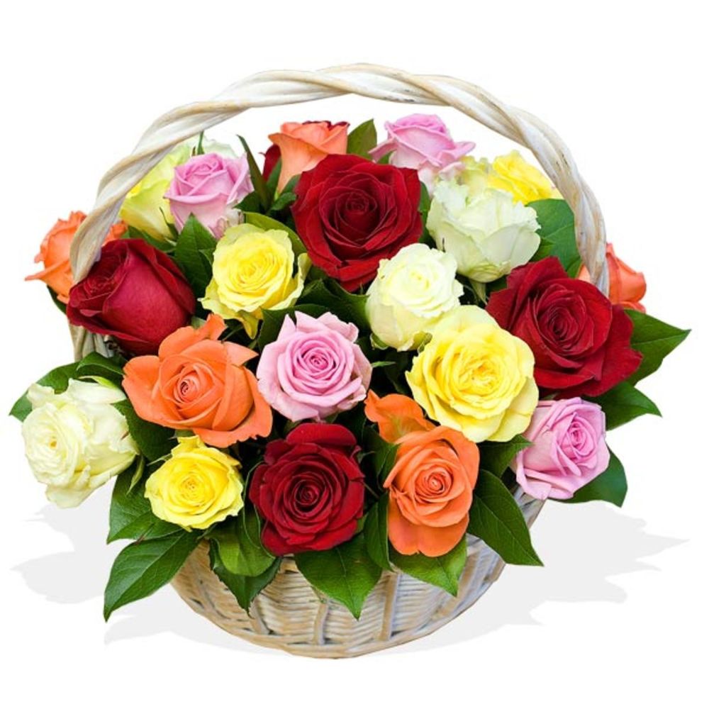 5 красных роз, 5 розовых роз, 5 оранжевых роз, 5 желтых роз, 5 белых роз, зелень, корзина.