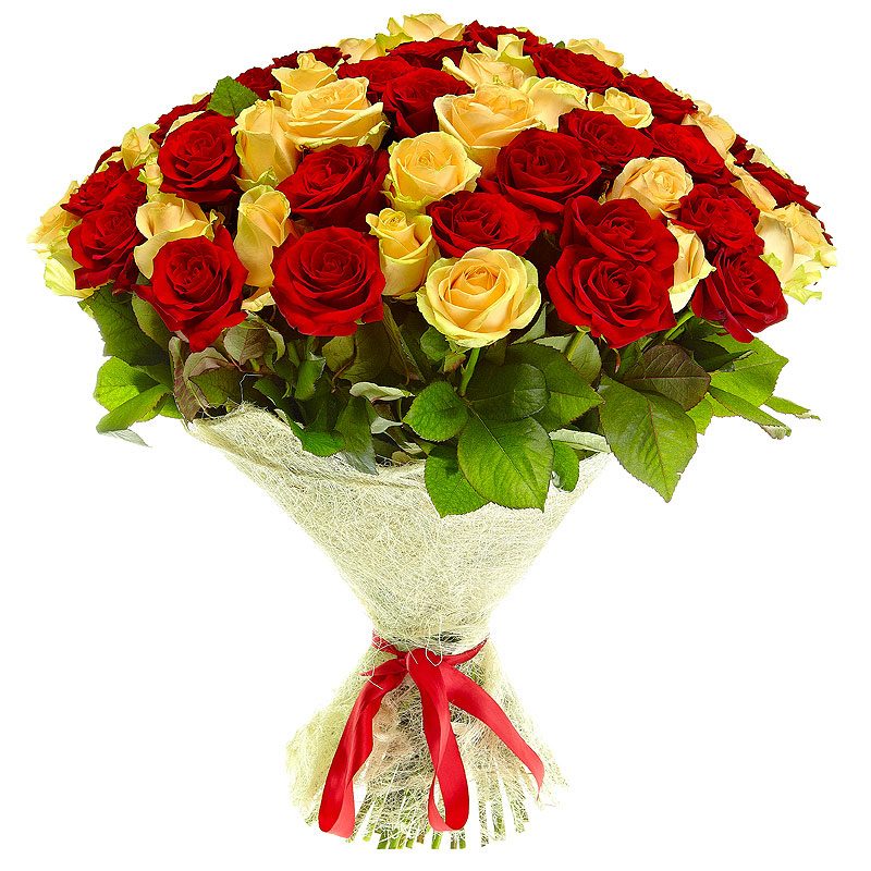 Букет состоит из 23 красные розы, 22 кремовые розы, прозрачная упаковка, атласная лента.