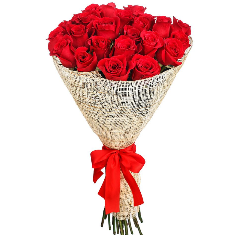 Букет состоит из 25 красных роз, сетка, атласная лента.