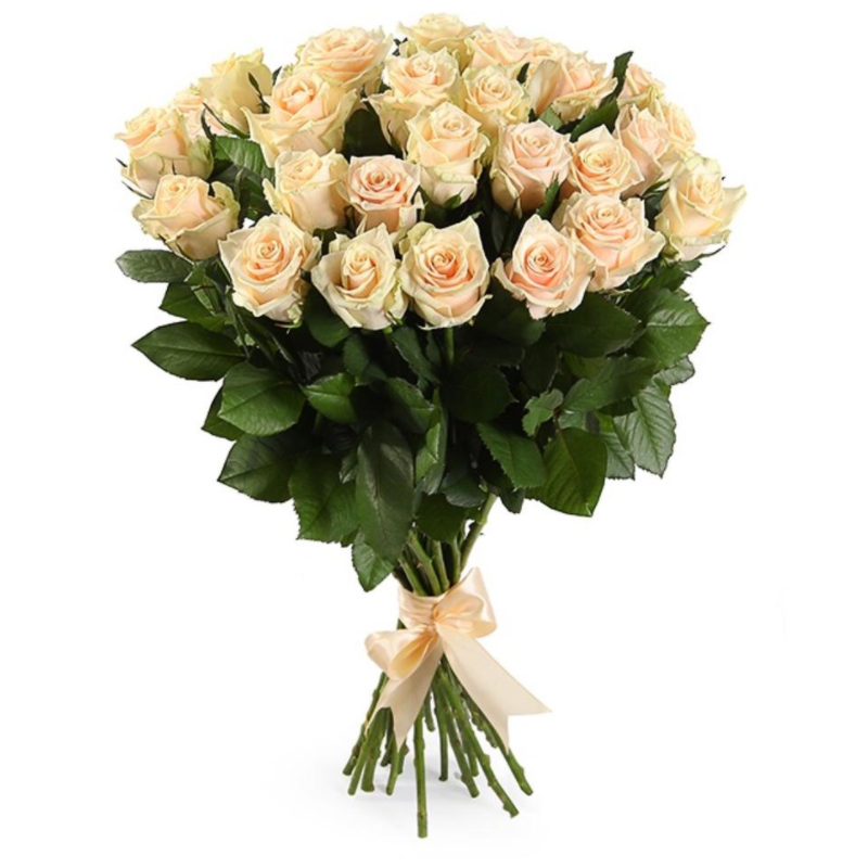 Букет состоит из 25 кремовых роз, прозрачная упаковка, атласная лента.