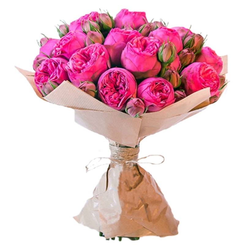 Букет состоит из 17 кустовых пионовидных роз, крафт, жгут.