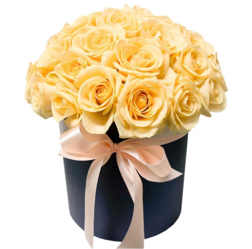 Букет состоит из 25 кремовых роз, коробка, атласная лента.