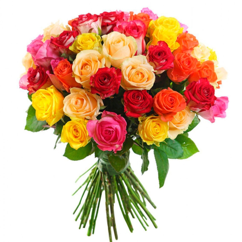 Букет состоит из MIX из 55 роз Кения, прозрачная упаковка, атласная лента.