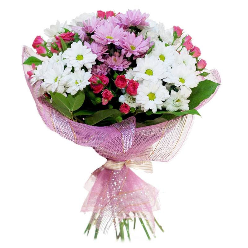 Букет состоит из 4 ветки красной кустовой розы, 4 ветки белой хризантемы, 1 ветка розовой хризантемы, красивая упаковка, лента.