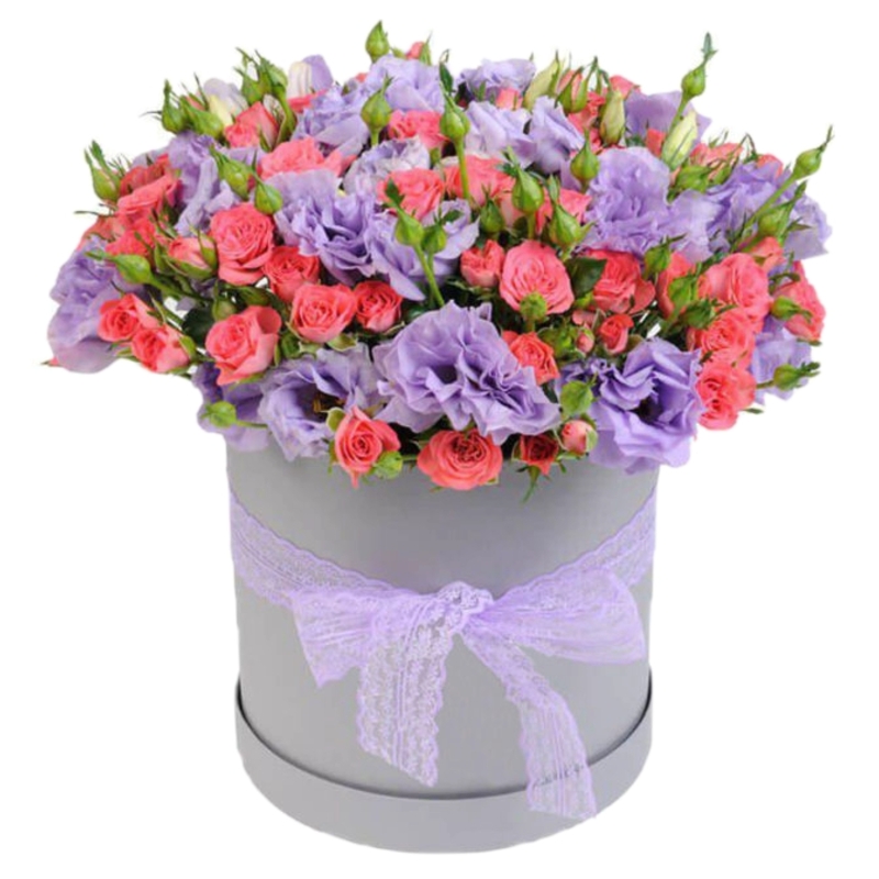 Букет из роз и эустомы в коробке