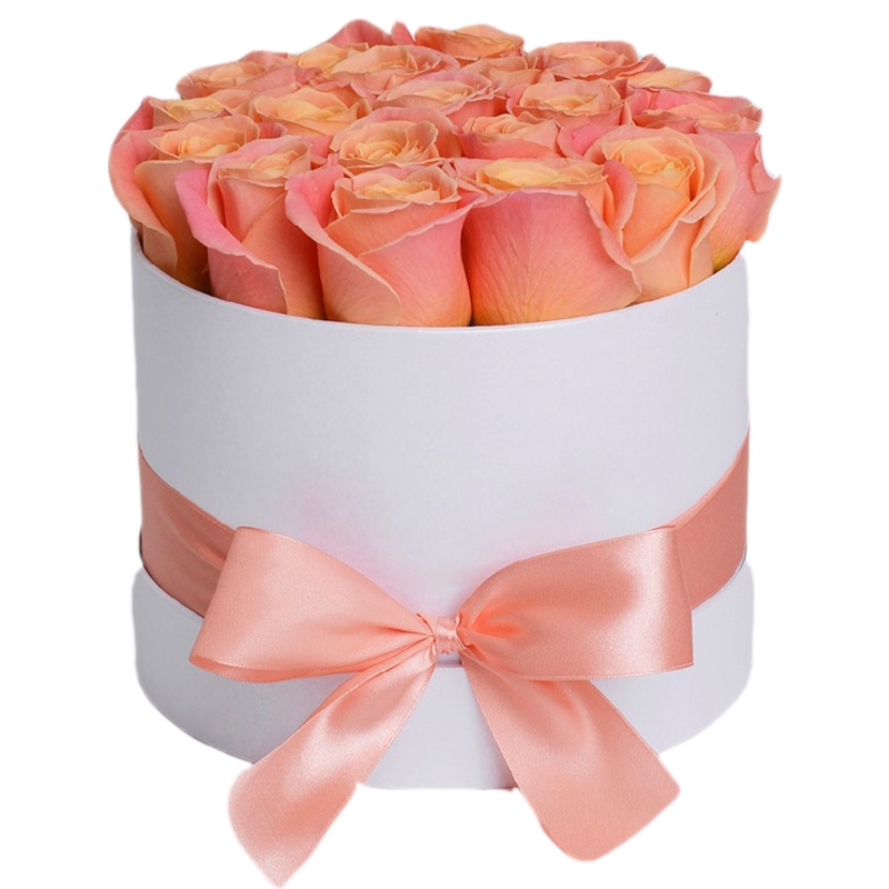 Букет состоит из 21 коралловая роза, коробка, оазис.