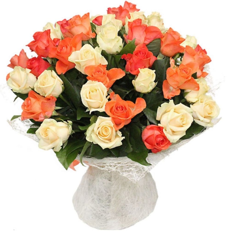 Букет состоит из 26 кремовой розы, 25 оранжевой розы, красивая упаковка, атласная лента.