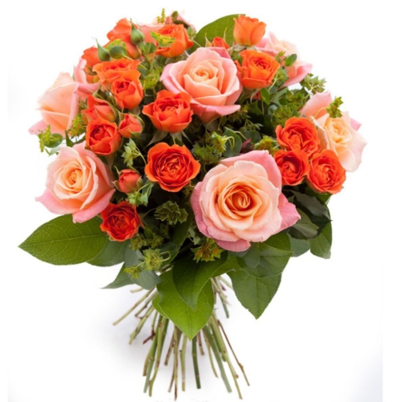 Букет состоит из 11 розовых роз, 14 оранжевых кустовых роз, зелень, прозрачная упаковка, атласная лента.