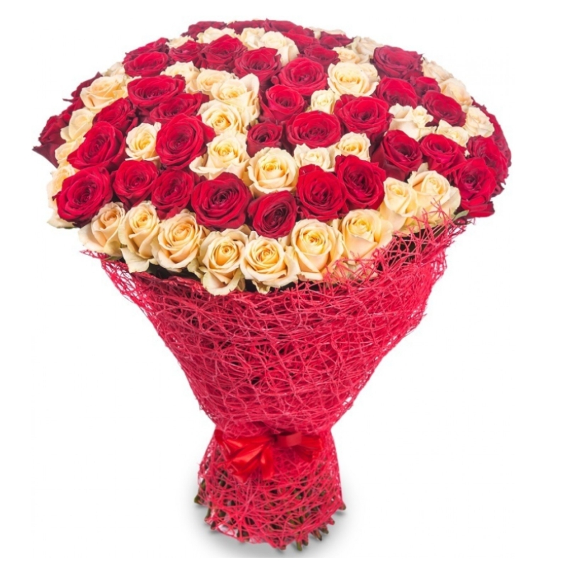 Букет состоит из 51 красная роза, 50 кремовых роз, красивая упаковка, атласная лента.