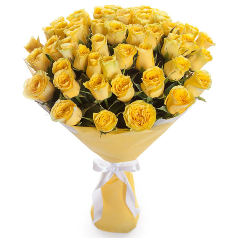 Букет состоит из 45 желтых роз, красивая упаковка, атласная лента.