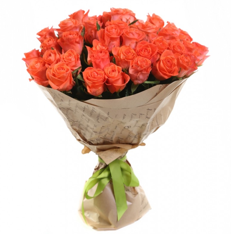 Букет состоит из 35 коралловых роз, крафт, атласная лента.