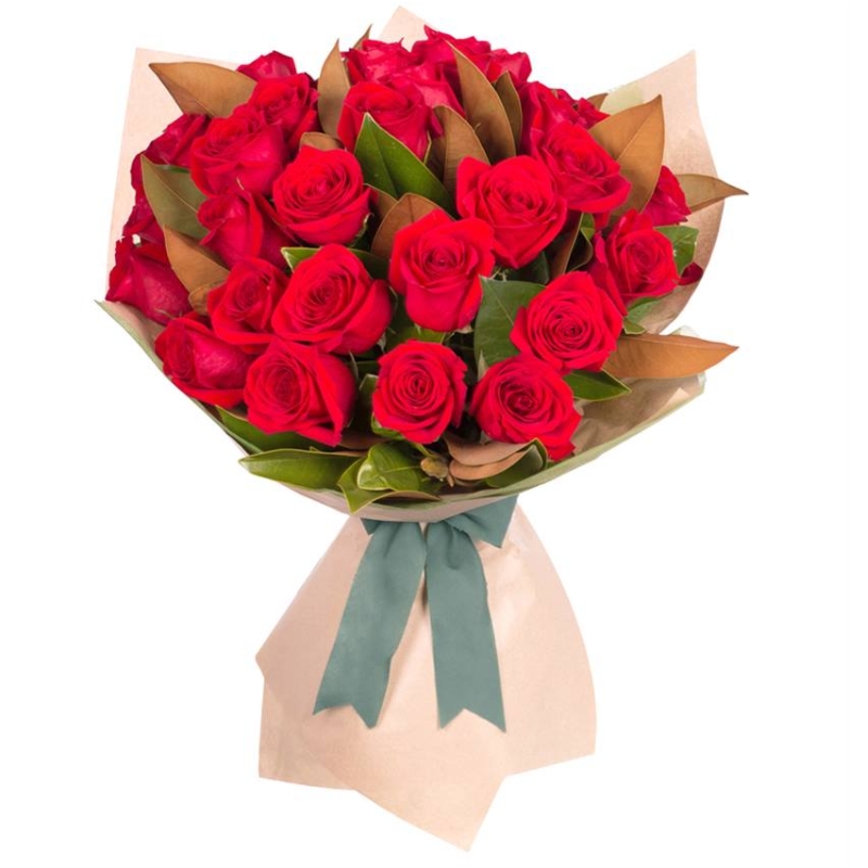 Букет состоит из 35 красных роз, зелень, крафт, атласная лента.