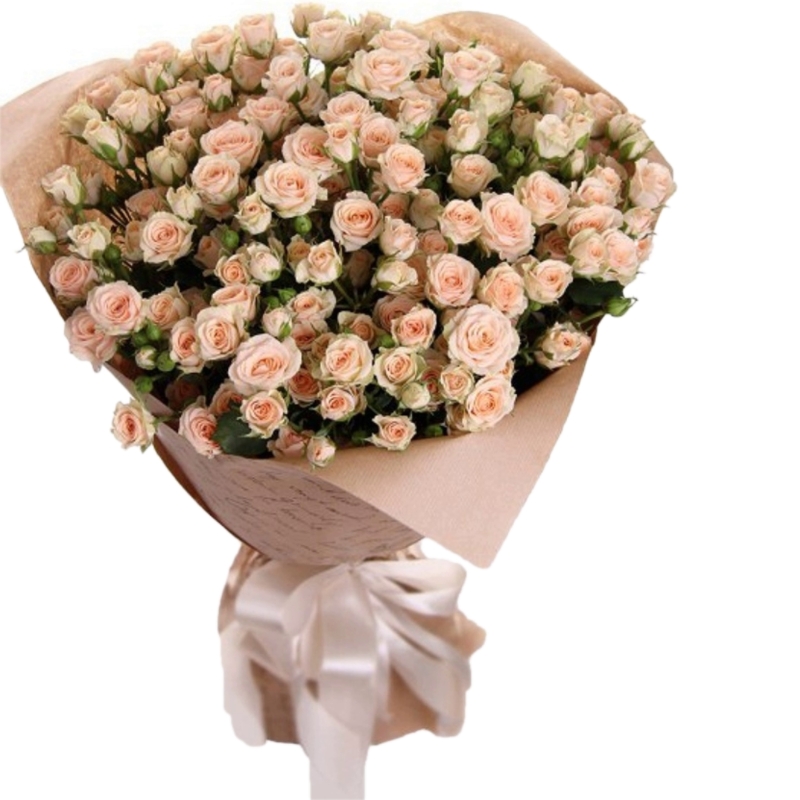 Букет состоит из 35 кустовых кремовых роз, крафт, атласная лента.