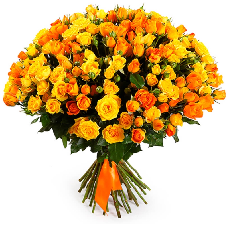 Букет состоит из MIX из 45 оранжевых и желтых кустовых роз, прозрачная упаковка, атласная лента.
