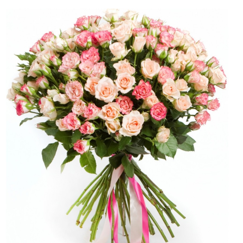 Букет состоит из MIX из 35 розовых и кремовых кустовых роз, прозрачная упаковка, атласная лента.