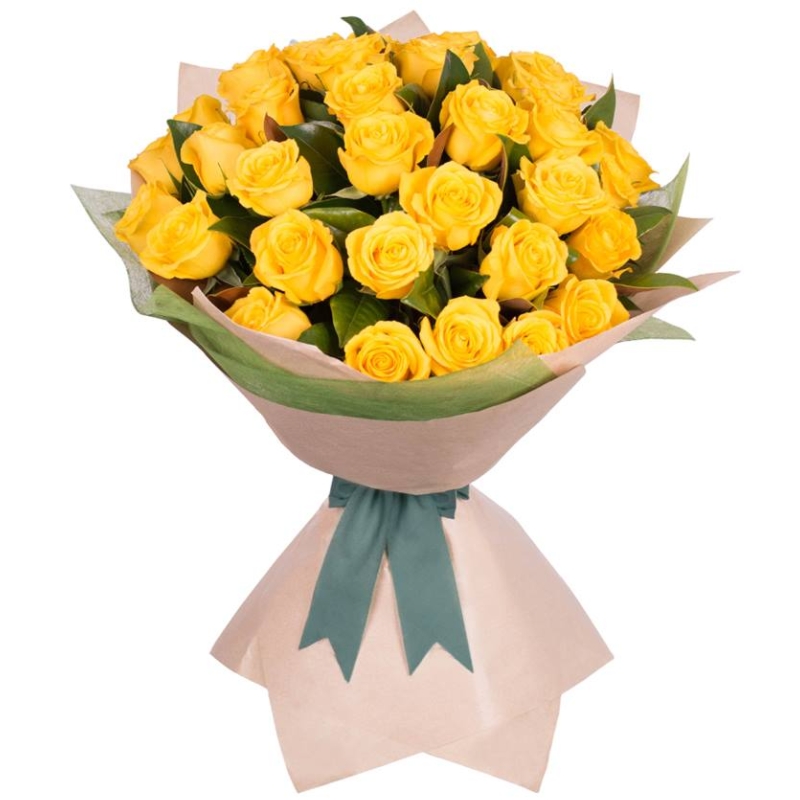 Букет состоит из 35 желтых роз, зелень, крафт, атласная лента.